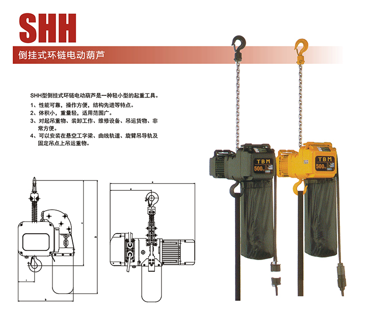 SHH型倒掛環(huán)鏈電動(dòng)葫蘆作為一種輕小型起重設(shè)備,是專門應(yīng)用于舞臺(tái)的一種優(yōu)勢產(chǎn)品,在長期的使用過程中發(fā)揮著超群的耐久性與高效性。下面我們一起來認(rèn)識(shí)下SHH型倒掛環(huán)鏈電動(dòng)葫蘆。 SHH型環(huán)鏈電動(dòng)葫蘆主要是由電動(dòng)機(jī)、傳動(dòng)機(jī)構(gòu)、鏈條以及吊鉤等部分組成。其表面進(jìn)行了黑漆處理,外觀光亮持久,美觀大方;鍍鋅鏈條經(jīng)過淬火處理,不易生銹,強(qiáng)度大,堅(jiān)固耐用;而馬達(dá)則密封在鋁質(zhì)的鋼圈圓柱形外殼內(nèi),適合與各種控制器和電路分電器相連。吊鉤則是采用優(yōu)質(zhì)合金鋼材料制造而成,具有耐磨耐腐、韌性大的特點(diǎn)。不僅如此,環(huán)鏈電動(dòng)葫蘆的優(yōu)勢還有如下幾點(diǎn):